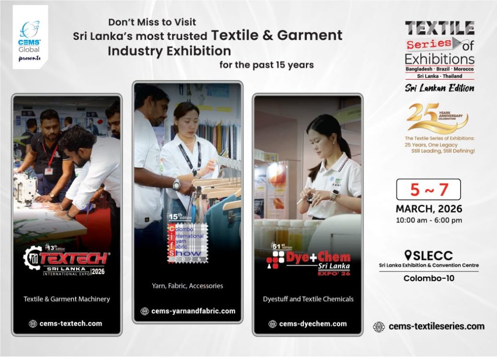 මෙම වසරේ පැවැත්වෙන පහළොස්වන ‘ටෙක්ස්ටයිල් සීරිස්‘ (Textile Series) ශ්‍රී ලංකා ප්‍රදර්ශනය , එකම ස්ථානයක පැවැත්වෙන අනුබද්ධ ප්‍රදර්ශන ත්‍රිත්වයක් හරහා පූර්ණ ඒකාබද්ධ මූලාශ්‍ර පරිසර පද්ධතියක් නැවතවරක් ඉදිරිපත් කරනු ලබයි. ඒ අනුව රෙදිපිළි හා ඇඟලුම් තාක්ෂණය හා යන්ත්‍රෝපකරණ පිළිබඳ දහතුන්වන Textech Sri Lanka ජාත්‍යාන්තර ප්‍රදර්ශනය , නූල්,රෙදිපිළි හා අතිරේක උපාංඟ පිළිබඳ පහළොස්වන Colombo International Yarn & Fabric Show 2026, ඩයිවර්ග මෙන්ම රසායනික ද්‍රව්‍ය පිළිබඳ පනස්එක්වන DyeChem Sri Lanka ජාත්‍යාන්තර ප්‍රදර්ශනය මෙහිදි පැවැත්වේ. සමස්ත සැපයුම්දාමය පුරා විහිදුණු ගෝලීය තාක්ෂණය , යන්ත්‍ර උපකරණ, අමුද්‍රව්‍ය සහ නවෝත්පාදන හවුල්කරුවන් සමග මෙරට ඇඟලුම් අංශය සම්බන්ධ කරන ශ්‍රී ලංකාවේ වඩාත් පුළුල් වේදිකාව ලෙස මෙය අඛණ්ඩව පැවැත්වේ.